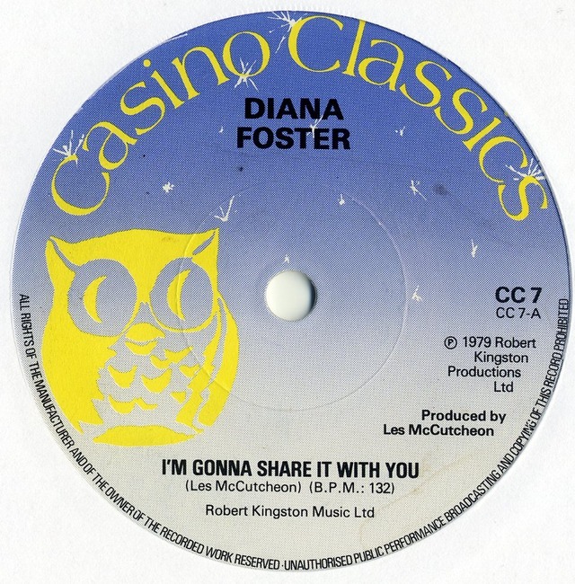 DIANA FOSTER / AUTUMN - Split Diana Foster - I'm Gonna Share It With You / Autumn - Time Out CASINO CLASSICS 1979 UK 7" -/ex (white vinyl) 英国女性シンガーによるスプリット・シングル。 最高のノーザン系スーパーソウル・チューン! 作曲/プロデューサーのLes McCutcheonはThis Year's Blonde - Platinum Popの仕掛人。 B面のAutumnはインスト・ソウルです。